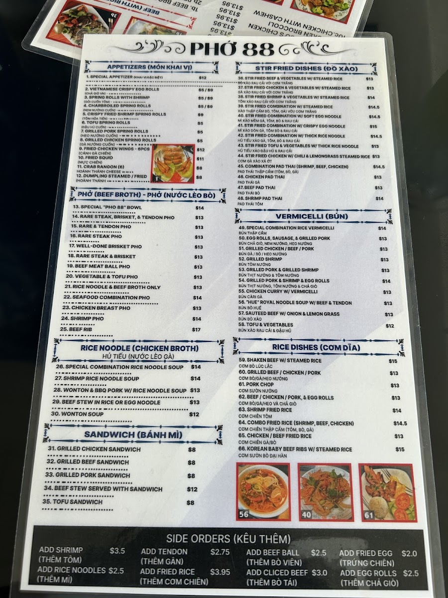 Welcome to Pho 88, a hidden gem located at 8223 Marbach Rd, San Antonio, TX. This Vietnamese eatery is renowned for its authentic flavors and a menu bursting with delightful options. Diners rave about the beef and brisket pho, a rich and fragrant soup that is a crowd favorite. Appetizers like spring rolls and crab rangoons set the stage for a memorable meal, with many praising their freshness and taste.